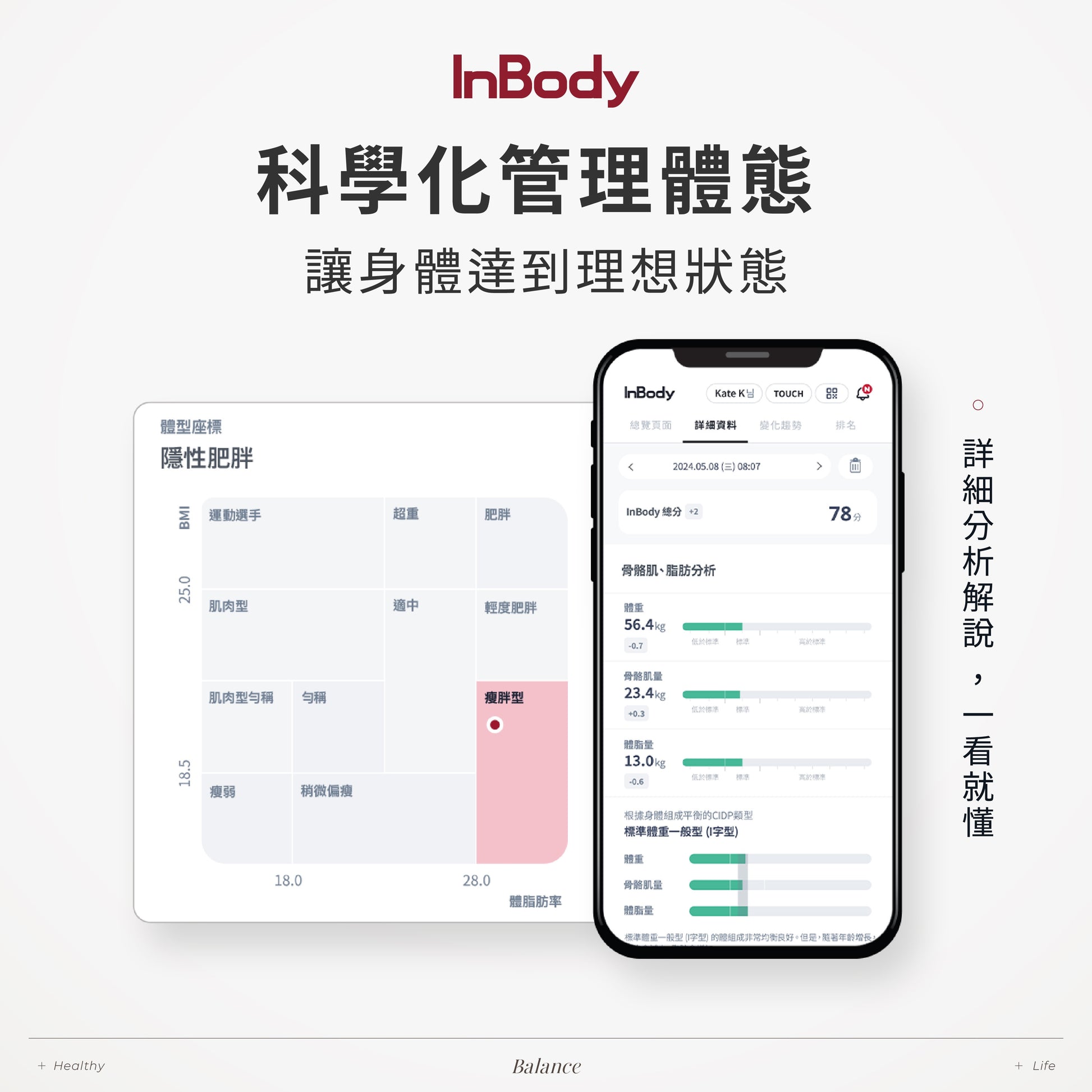 體重、骨骼肌量、體脂量、BMI、體脂率、身高、內臟脂肪等級、InBody分數、 基礎代謝率(BMR)、健康檢查結果(我在同年齡層中的位置) |